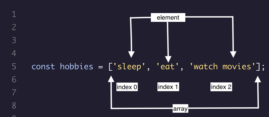 - ข้อมูลแต่ละอันคั่นด้วยเครื่องหมาย comma และจะถูกเรียกว่า element เช่น array ตามรูปด้านบน มี 3 element