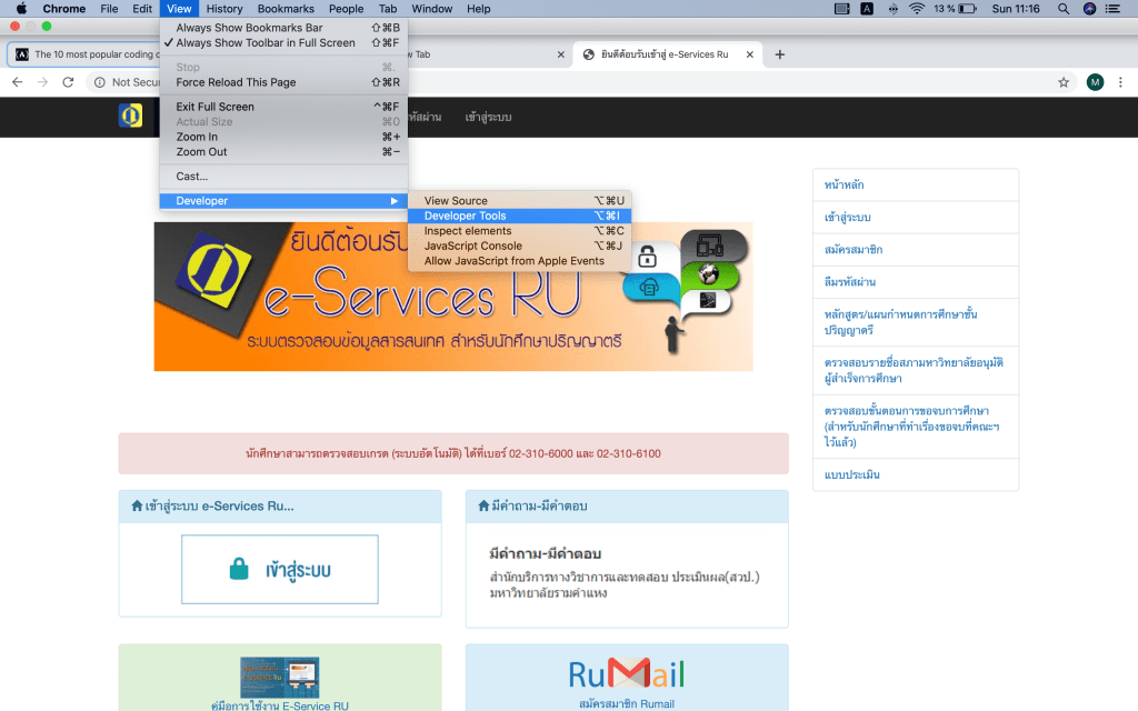 - เปิด Google Chrome -> กด View -> Developer -> Developer Tools