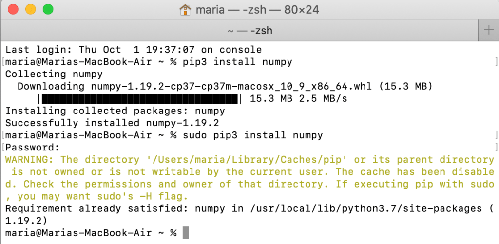 เนื่องจากคอมพิวเตอร์ของผู้เขียนมีทั้ง Python และ pip ติดตั้งแล้ว (macOS) เราจะใช้ pip ในการติดตั้ง NumPy