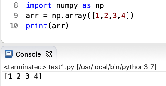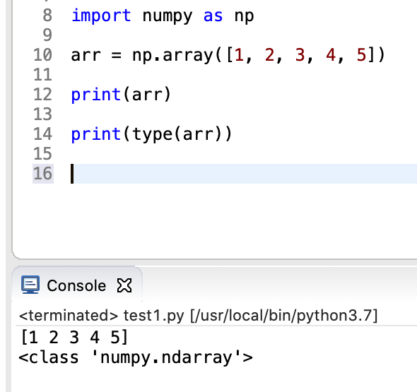 NumPy ถูกใช้ทำงานกับ arrays วัตถุที่เป็น array ใน NumPy เรียกว่า ndarray เราสามารถสร้าง NumPy ndarray object ได้โดยใช้ฟังก์ชั่น array()