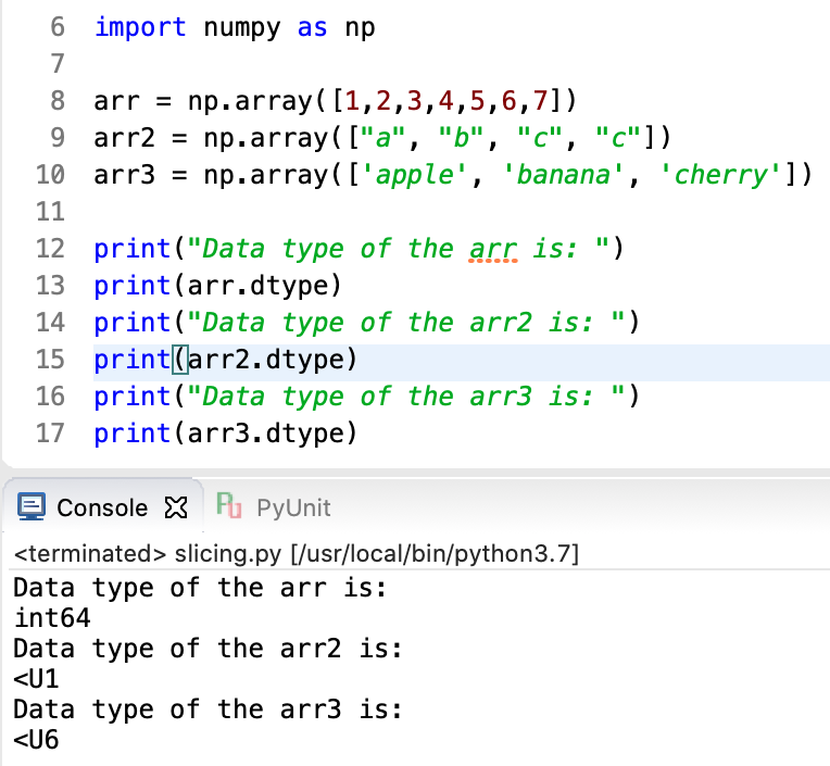 วัตถุที่เป็น NumPy array มี property ที่เรียกว่า dtype ซึ่งจะให้ค่า return เป็น ชนิดของข้อมูล