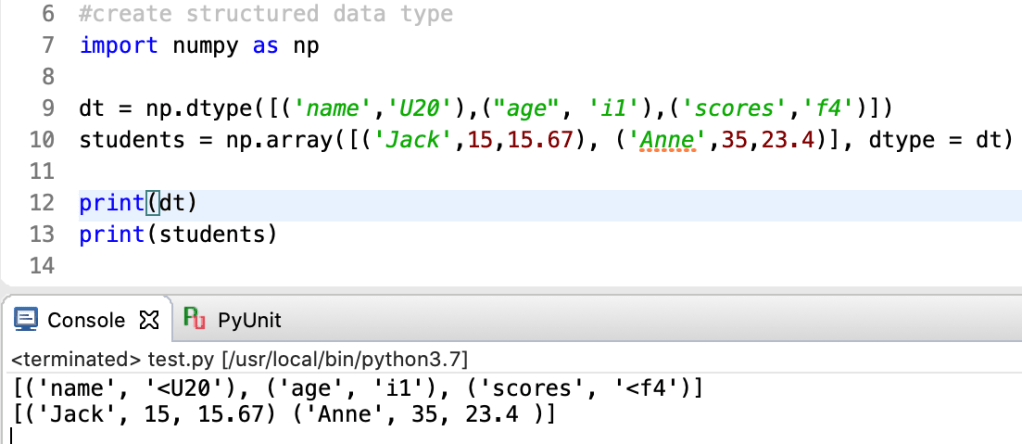 เราสามารถใช้ฟังก์ชั่น array() ในการสร้าง array อันใหม่ ฟังก์ชั่นนี้สามารถใส่ argument (dtype) เป็นตัวเลือกที่ใช้ในการกำหนดชนิดข้อมูลที่เราคาดหวังสำหรับสมาชิกใน array ได้