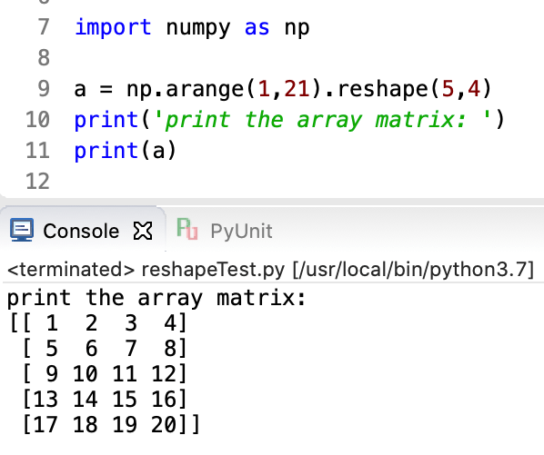 จากตัวอย่างใช้ฟังก์ชั่น np.arange() สร้าง array แบบหนึ่งมิติ มีสมาชิกตั้งแต่ 1-20 ทั้งหมด 20 ตัว จากนั้นใช้ attribute reshape() เปลี่ยนมิติเป็น 2 มิติ โดยให้มีแถว 5 แถว แต่ละแถวมีสมาชิก 4 ตัว