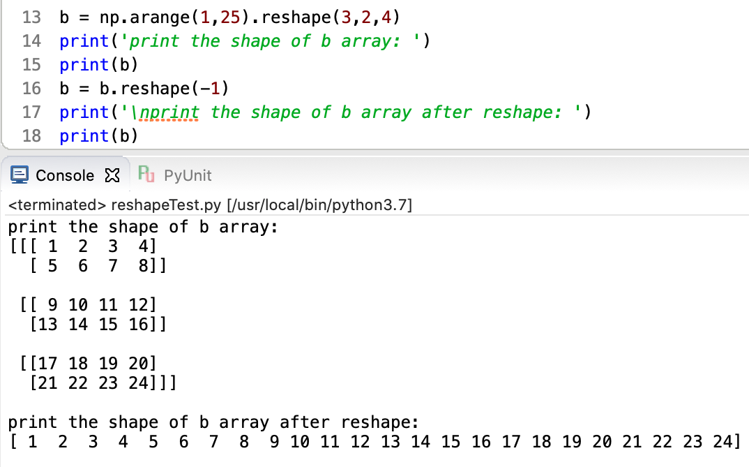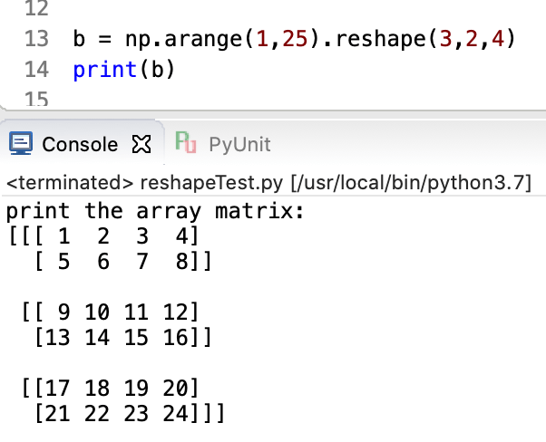 จากตัวอย่างใช้ฟังก์ชั่น np.arange() สร้าง array ที่มีค่าตั้งแต่ 1-24 มีสมาชิกทั้งหมด 24 ตัว มี 1 มิติ จากนั้นใช้ attribute reshape() เปลี่ยนมิติเป็น 3 มิติ โดยจัดสมาชิกทั้งหมดออกเป็น 3 กลุ่ม (24/3 = 8) โดยแต่ละกลุ่มจะมีสมาชิกทั้งหมด 8 ตัว จากนั้นจัดสมาชิกออกเป็นกลุ่มละ 2 แถวเท่าๆกัน (8/2 = 4) ในแต่ละแถวจะมีสมาชิก 4 ตัว