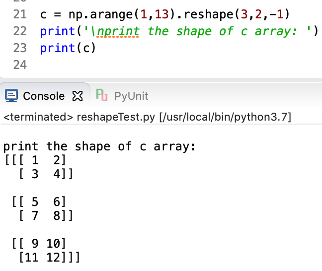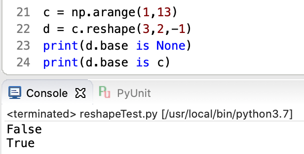 สร้าง array ชื่อ c เป็น 1 มิติด้วยฟังชั่น arange() จากตั้งตัวแปร d ให้มีค่าเท่าเป็น array c ที่ใช้ attribute reshape() เปลี่ยนมิติเป็น 3 มิติ