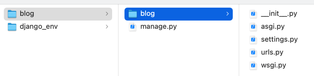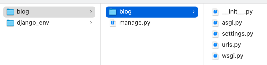 หากเราเข้าไปดูโฟลเดอร์ที่เราสร้าง เช่นใน macOS กดที่ Finder และเข้าไปในโฟลเดอร์ directory จนถึงชื่อโฟลเดอร์ที่เป็นชื่อโปรเจ็คของเรา เราจะเห็นไฟล์ชื่อ manage.py อยู่คู่กับโปรเจ็คที่เราสร้าง และในโปรเจ็คที่เราสร้าง มีไฟล์อยู่ข้างในอยู่แล้ว