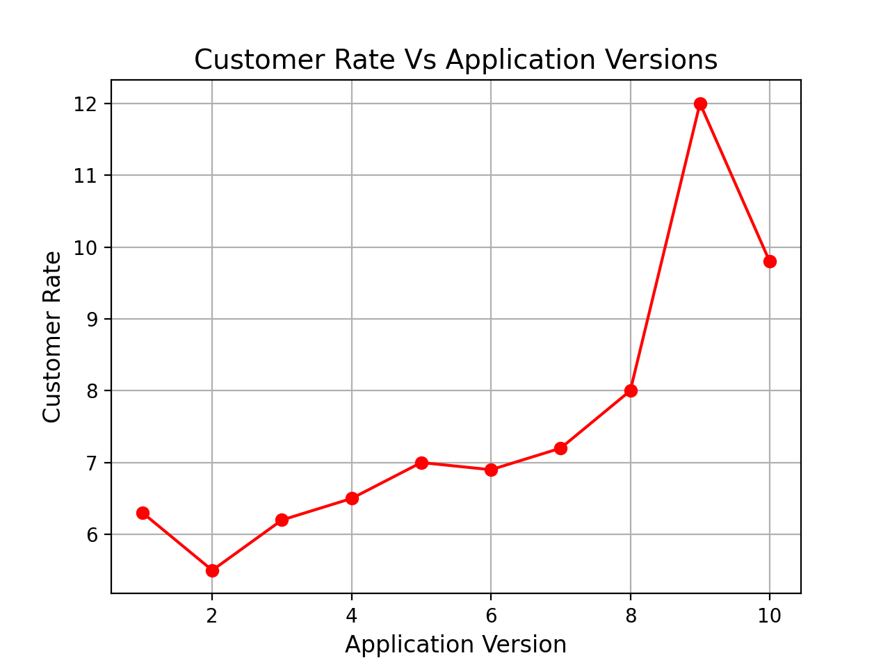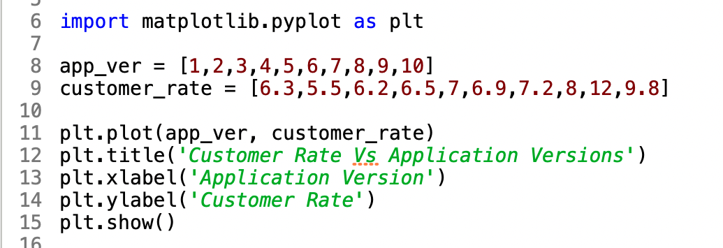 บรรทัดที่ 15 เรา plot กราฟโดยให้ใช้ข้อมูลจาก DataFrame สองคอลัมน์ คือ app_version และ customer_rate กำหนดให้เส้น line เป็นสีแดง และ mark แต่ละจุดด้วย o