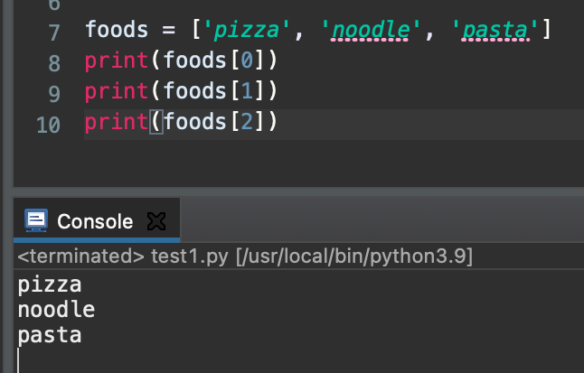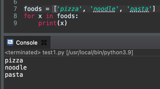 ด้านบนนี้เป็นตัวอย่าง Loop และการ execute โปรแกรม ซึ่งแสดงผลเป็น pizza, noodle, และ pasta ในแต่ละบรรทัด