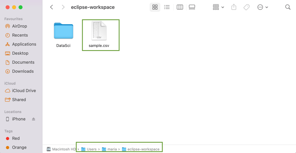 เมื่อนำมาต่อกันจะได้เป็น /Users/maria/eclipse-workspace/sample.csv