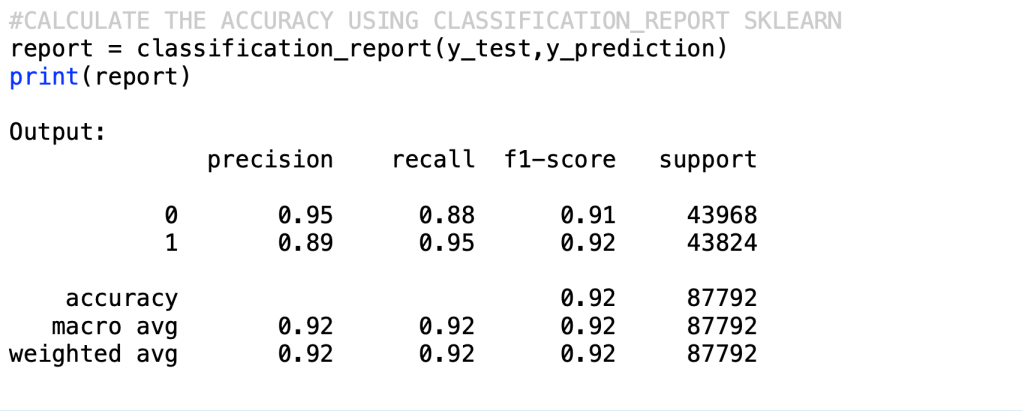 ต่อมาเราต้องคำนวณว่าโมเดลที่เราสร้างมีความถูกต้องมากน้อยแค่ไหน เราจะใช้ classification_report จาก sklearn ค่าที่ได้จะมีค่า 0-1 โดย 1 แปลว่ามีความแม่นยำมาก