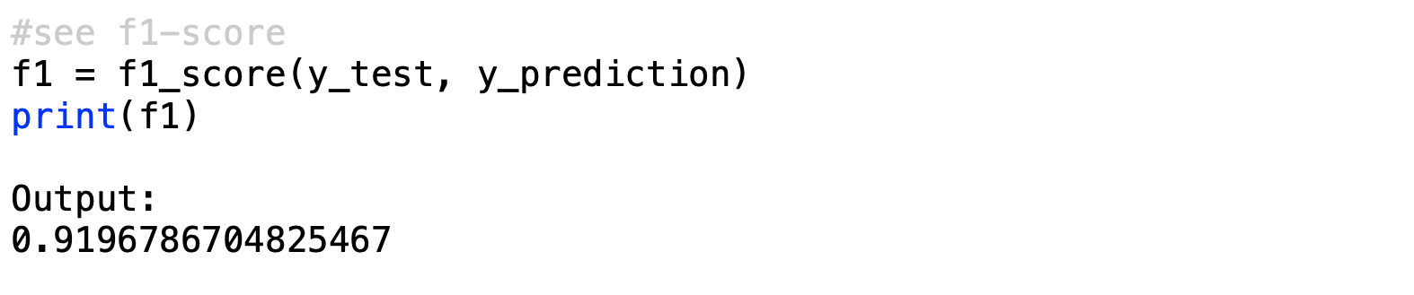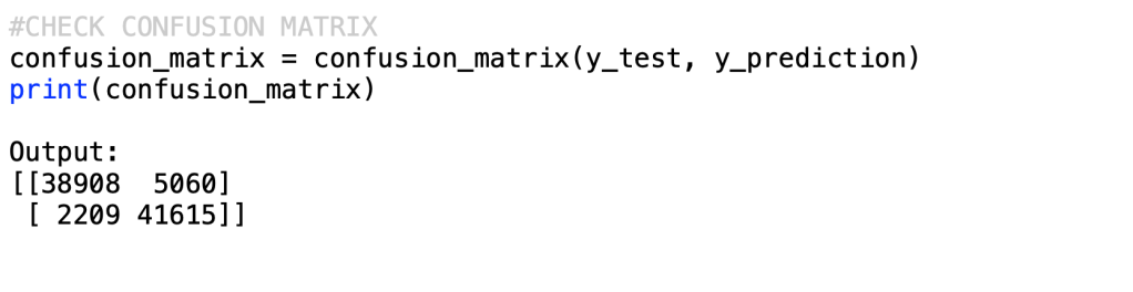 หมายความว่าโมเดลของเราทำนายผลถูกต้อง 38908 + 41615 = 80523 ครั้ง และทำนายผลผิดพลาด 5060 + 2209 = 7269 ครั้ง